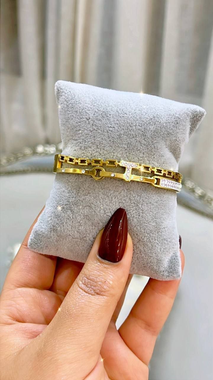 & Free Shippingاسوارة تيفاني ملكية مطلية بطبقة من الذهب مزخرفة بتفاصيل هندسية راقية مع لمعة بتخطف الانظار بالاضافة الى وجود فصوص صغيرة تشبه الالماس التي تزيد من جماليتها واناقتها عند ارتدائها