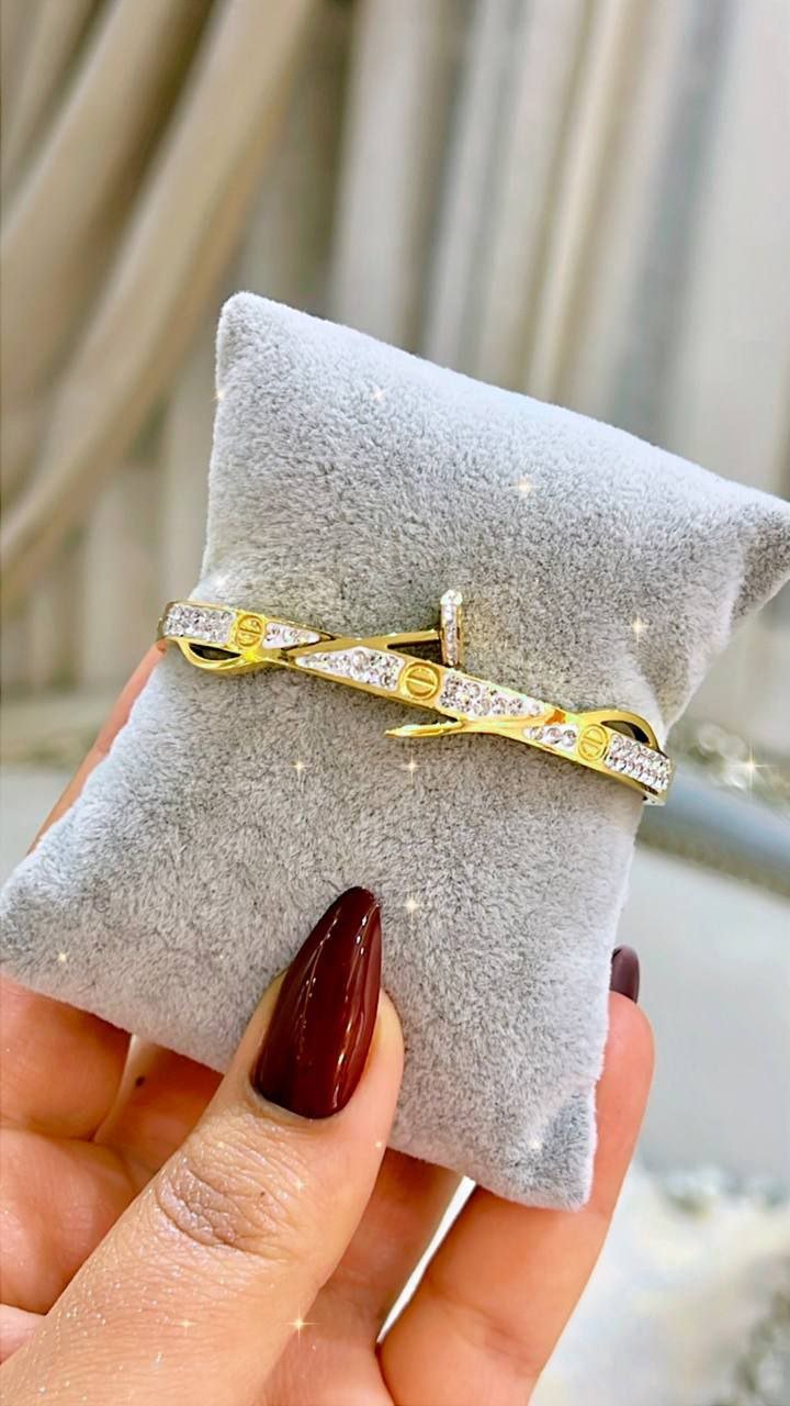 اسوارة من مجموعة كارتير اسوارة مطلية بطبقة من الذهب ومرصعه مما يجعلها قطعة مميزه وجذابة يمكن ارتداء هذه الاسوارة في مختلف المناسبات سواء كانت رسمية وغير رسمية ويمكن تنسيقعا بمفردها او مع مجموعة اخرى من الاساور لاطلالة متكاملة