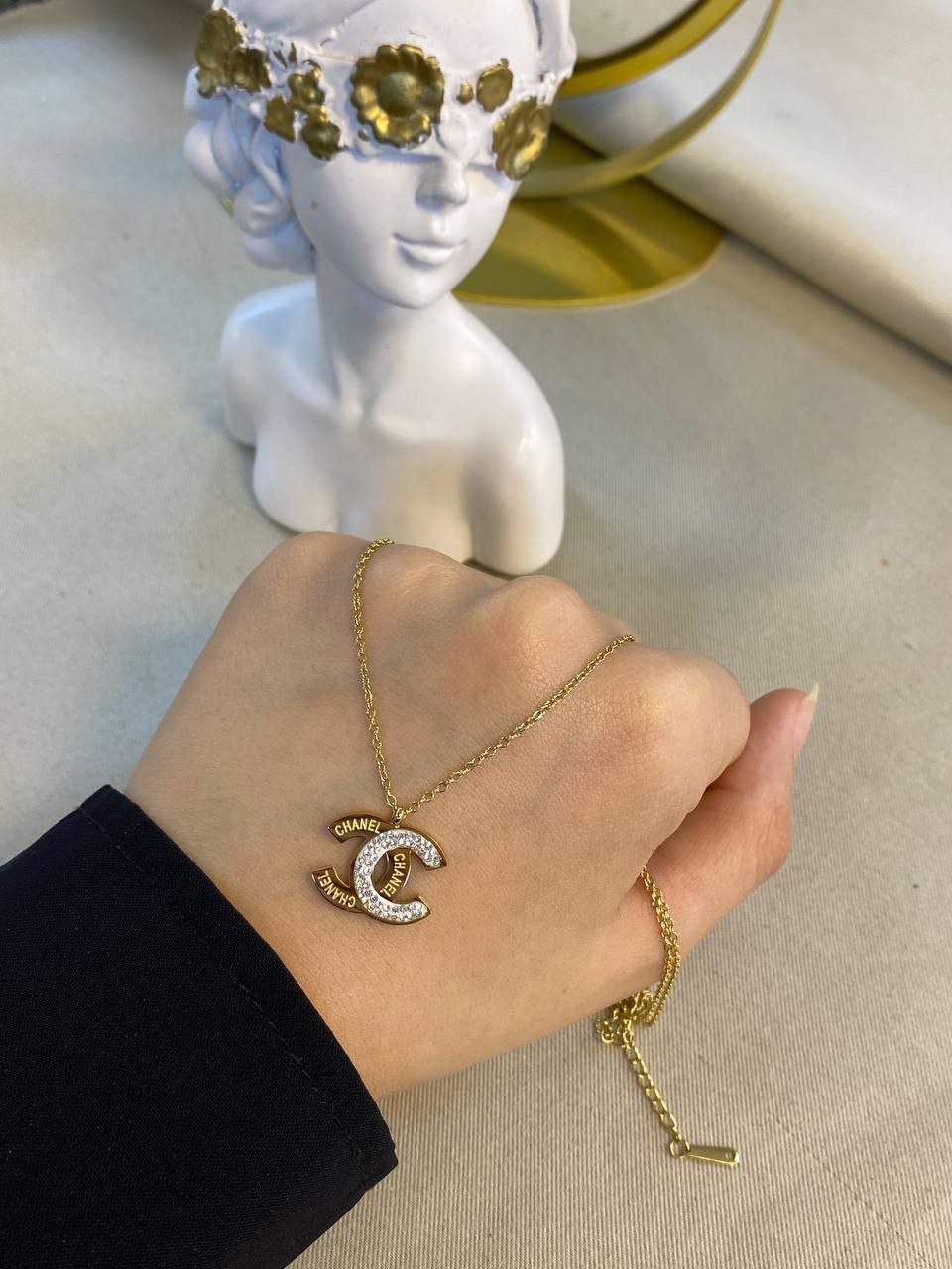عقد شانيل مطلي بطبقة من الذهب ومرصع بفصوص صغيرة تشبه الالماس تزيد من اناقتة وجاذبيتة ليضيف على اطلالتك رونق وجمالية عند ارتدائة